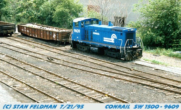-Click here to see Conrail SW 1500 #9609, built by EMD in 1972 . It is working in the Frankford Junction Yard, Philadelphia Pennsylvania. 7/21/95.