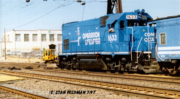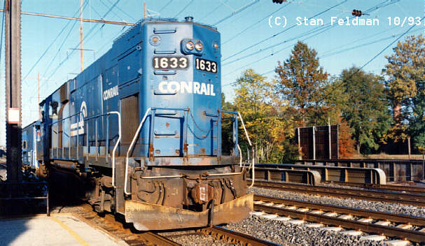 -Click here for a more recent view of Conrail #1633 GP-15-1 at Holmesburg Jct. on the Amtrak NEC. The engine is in fresh paint, with Operation Lifesaver on its sides, and Conrail Quality on its nose. 7/97.| Click here to Search Stan's RailPix ! |
