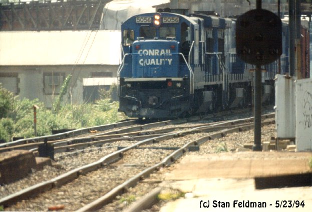 -Click here to see a front view of Conrail B-36-7 #5056, built by GE in 1983. It has just passed Shore Tower on the Conrail track with a train from Harrisburg Pa., and is pulling up to Frankford Junction, Phila. Pa, to drop off a cut of cars. It will then continue to Camden N.J. 5/94.