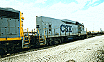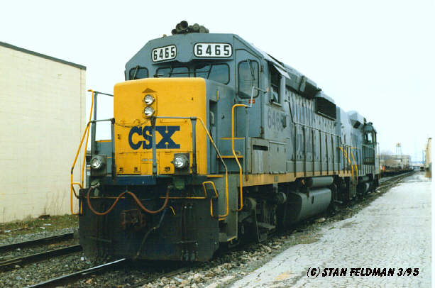 Click here to view the front of CSX 6465 {GP-40-2 } at rest between jobs at the Port of Phila. Pa. 3/95.