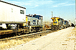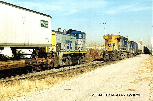 Click here to see CSX MP-15-AC #1156 pulling a cut of cars past CSX C44-9W #9016. CSX #9016 will leave with its train when the 1156 is clear. Port of Philadelphia. Pa. 12/4/98.