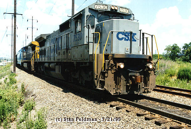 Click here for a front view of CSX C-40-8 #7530 on the Conrail Delair Line near the Delair Bridge. The CSX engine is leading a train in run through service on Conrail, headed to Pavonia Yard in Camden N.J. 7/21/95.