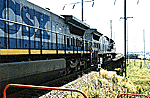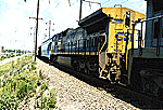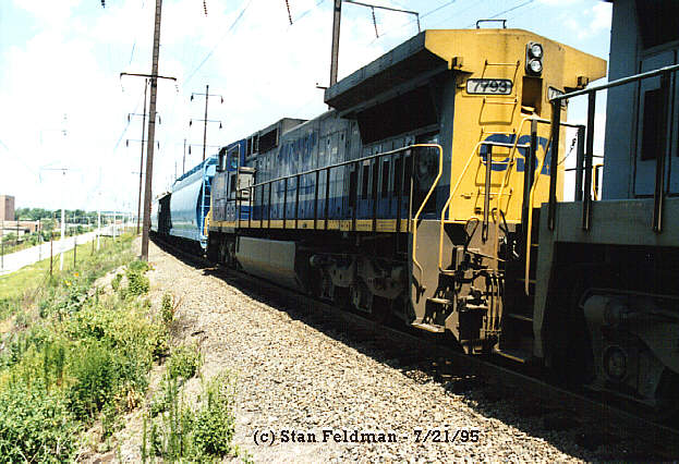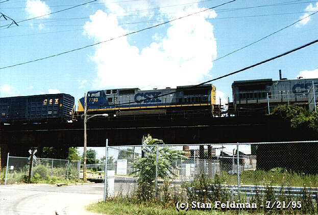 Click here for a close rear look at CSX C-40-8W #7793, trailing CSX C-40-8 #7530 on the Conrail Delair Line near the Delair Bridge. The CSX engines are in run through service on Conrail, headed to Pavonia Yard in Camden N.J. 7/21/95.