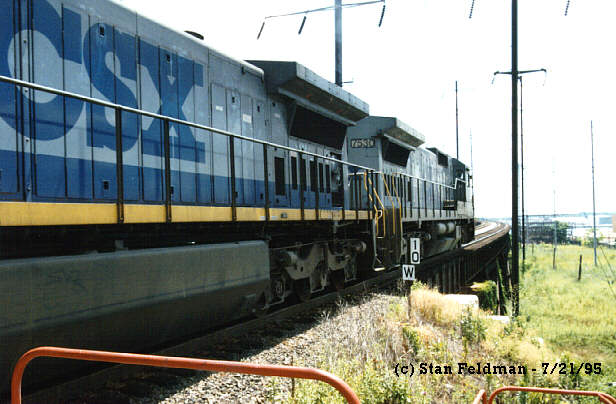 Click here for a rear view of CSX C-40-8 #7530 as it heads on to the Conrail Delair Bridge. The CSX engine is leading a train in run through service on Conrail, headed to Pavonia Yard in Camden N.J. 7/21/95.