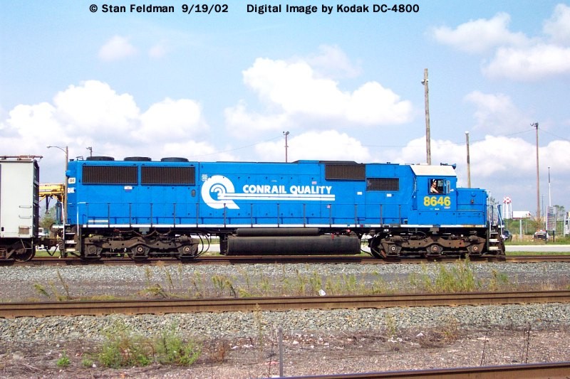 Click here to see CSX SD-50 # 8646, former Conrail # 6705 built by EMD in 1983, rated at 3500 HP and still in Conrail Quality paint. It is working on the Belt Line, Port Of Phila. Pa. 9/19/02.