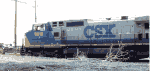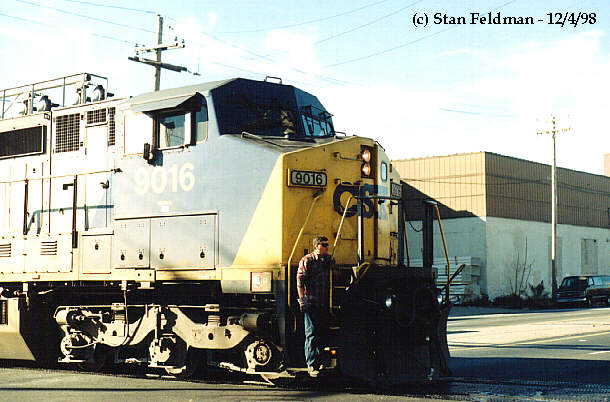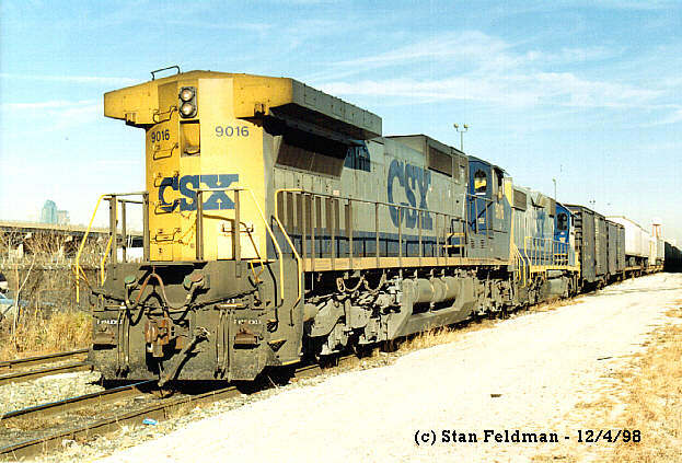 -Click here to see a front end view of CSX C44-9W #9016. It is moving to pick up a train from the Snyder Ave. Yard, Port of Philadelphia. Pa. 12/4/98.