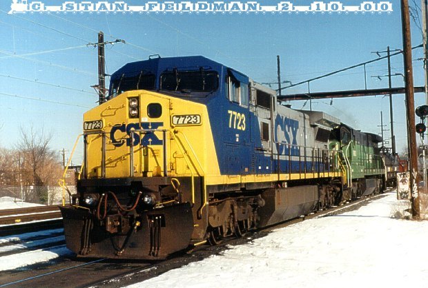 -Click here to see CSX C-40-8W #7723 on train CAO-1, in the snow at Frankford Junction, Philadelphia Pennsylvania. Second engine is RMGX #5046. 2/10/00.