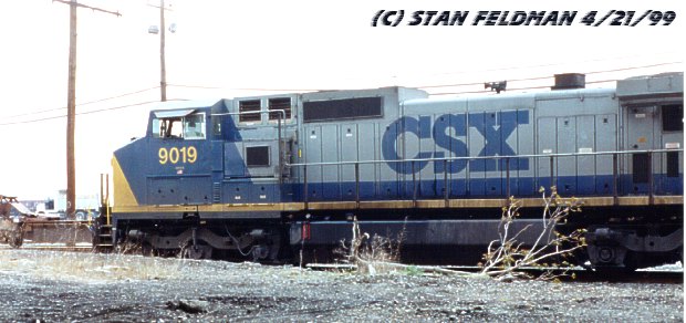 -Click here for a side view of CSX C44-9W #9019. It is leading a train through Greenwich Yard, to the Snyder Ave. Intermodal Yard in Philadelphia Pa. 4/21/99.