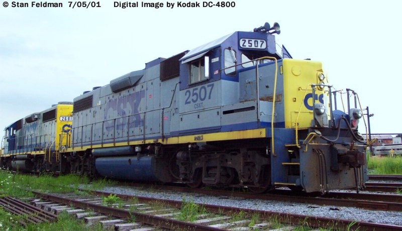 -Click here for a front view of CSX GP38-2 # 2507, built by EMD in 1973 and rated at 2000 HP. At one time CSX had 186 GP-38-2 locomotives. Lansdale Pa. 7/5/01.