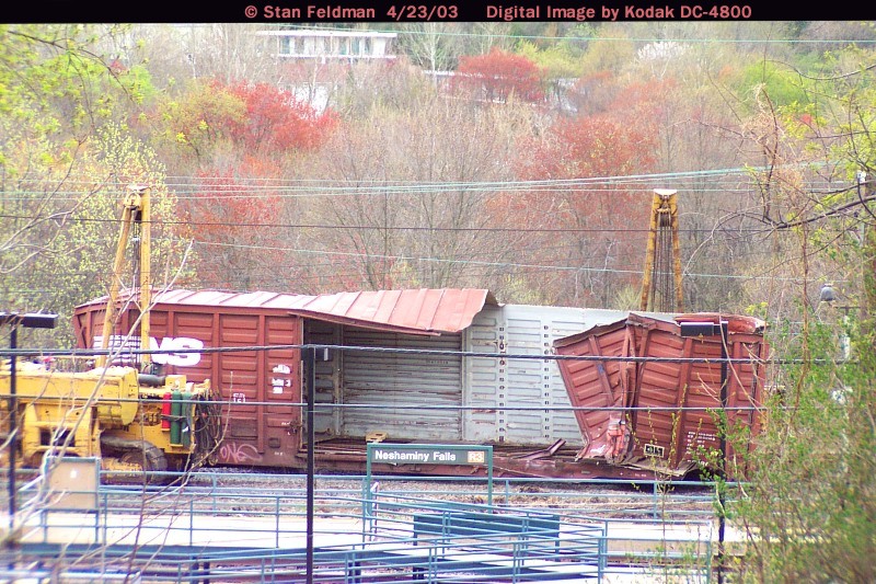 Here we have the remains of 2 boxcars from the derailment near the Septa Neshaminy Falls SEPTA R-3 Regional Rail station in Bucks County ,Pa. The cars will eventually be cut up and removed from the site. 5/5/03.