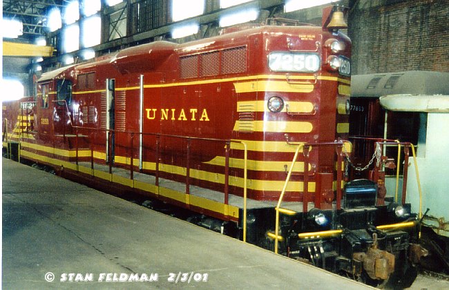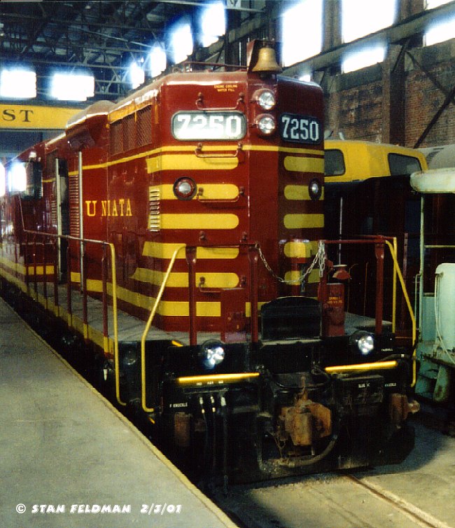 Click here to see Juniata Terminal (JTFS) GP-10 #7250, former Conrail #7583. This engine was built by EMD in 1959, remanufactured by Conrail in 1979, and is rated at 1850 HP. It is seen here inside Juniata Terminal Company, Phila. Pa. 2/3/01.