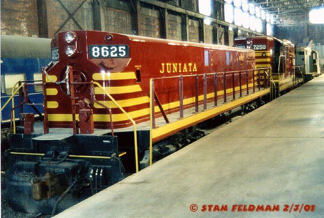 Click here to see Juniata Terminal (JTFS) slug #8625, former Conrail MT-4 #1013. This slug, built in 1957, is seen here with Juniata Terminal (JTFS) GP-10 #7250. Juniata Terminal Company, Phila. Penna. 2/3/01.