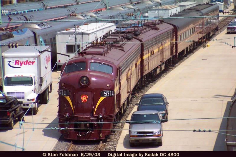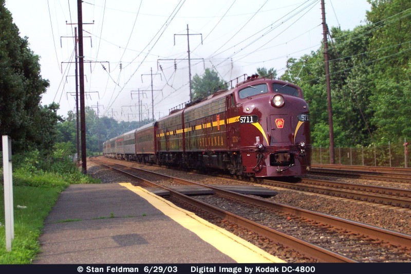 Click here to see restored Juniata Terminal PRR E-8a #5711 and PRR # 5809 running on The Northeast Corridor with a train of Private Cars. The train is passing Crum Lynne Station ( MP 11.1 ) and heading south to Washington DC. 6/29/03.