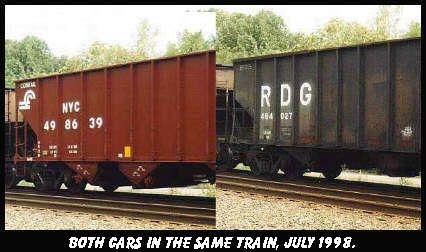 Click here to see a Conrail Hopper car marked NYC , in the same train with a Conrail Hopper marked RDG (Reading Company). Conrail cars are being marked NYC and PRR for the "merger" with CSX Inc, and Norfolk Southern Inc. 7/30/98.