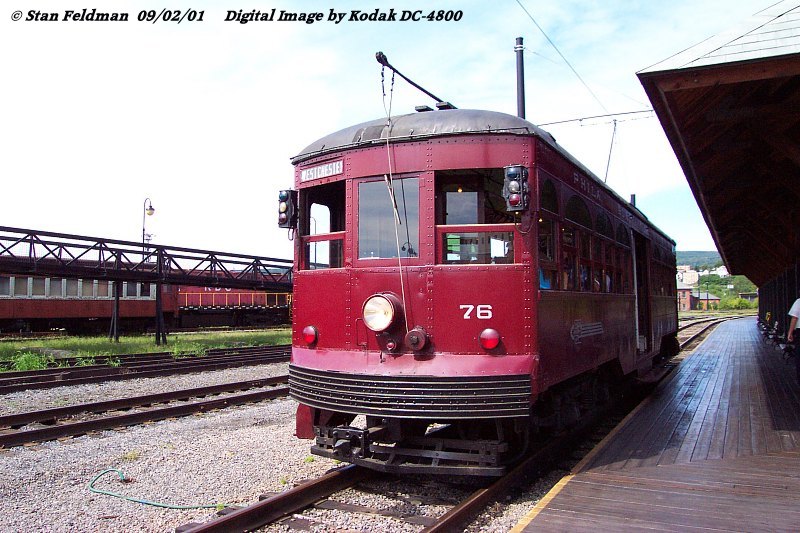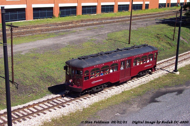 Click here for a top view of Philadelphia Suburban Transit Company (Red Arrow) center door car #76. It is running in excursion service near the mall at Steamtown National Historic Site in Scranton Pa. 9/2/01.