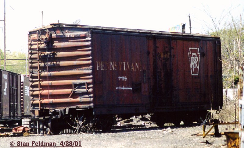 Click here to see a Pennsylvania Railroad (PRR) box car at the Conrail Midvale Yard, Phila. Penna. This car, no longer in revenue service, is used for storage. 4/28/01.