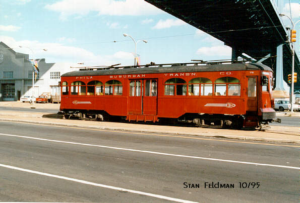 Click here to see Phila. Suburban Transit Co. #76 . This car was in service as a Penn's Landing Trolley in Phila. Pa. , about a month before the service was abandoned. 10/95.
