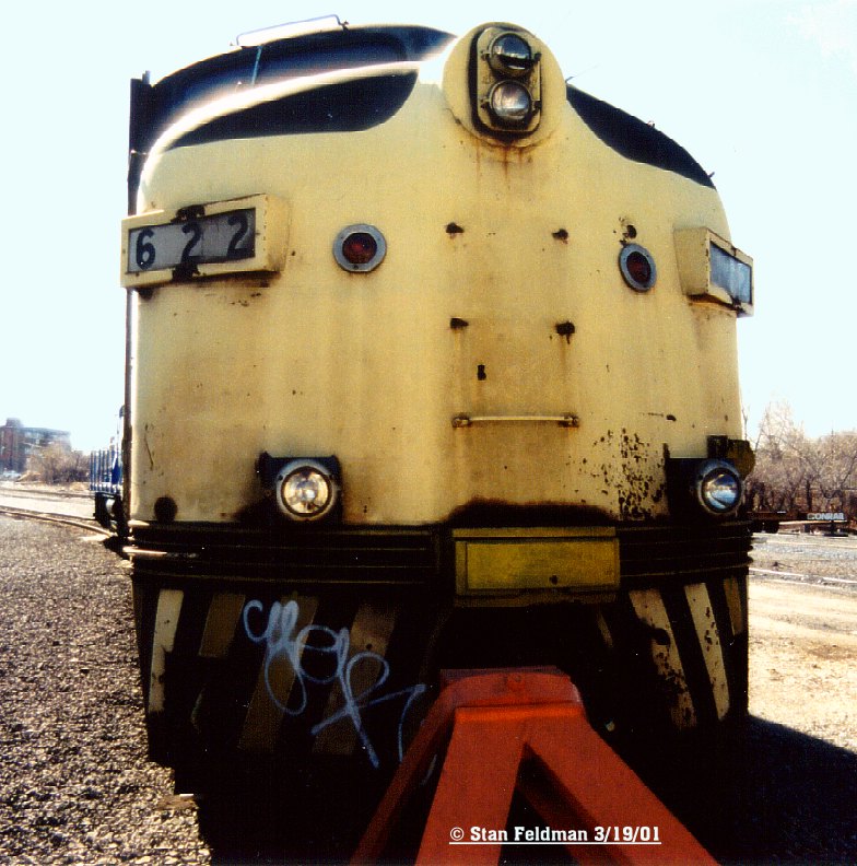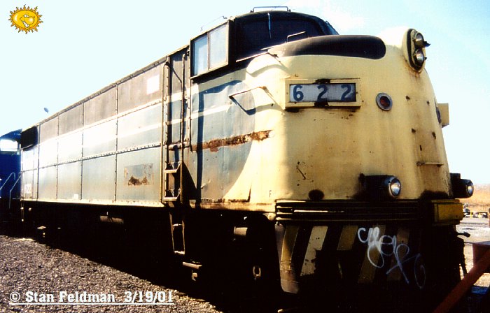 Click here for a front 3/4 view of Long Island Railroad (LIRR) "Power Pack" #622. It is sitting under the afternoon sun at the Pavonia Engine Terminal, Camden N.J. 3/19/01.