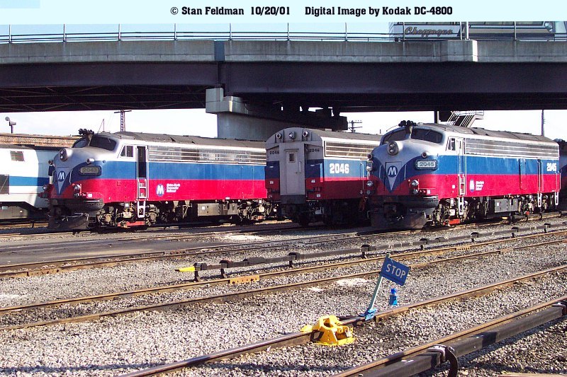 -Click here for a wide look at Metro North MTA Metro-North Diesel-Electric / Electric Locomotives FL9AC's # 2043 # 2045, # 2046. They are in the South Yard, at the Croton-Harmon N.Y.Shop. 10/20/01.
