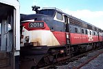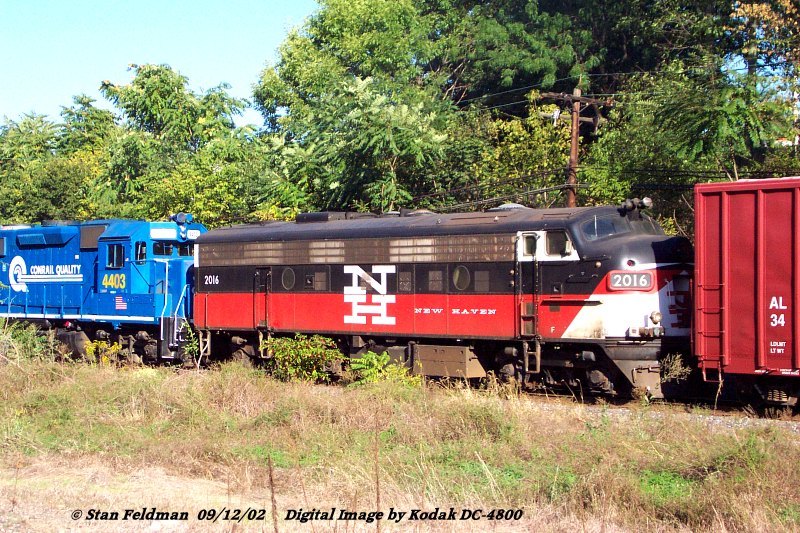 -Click here to see a rear close view of New Haven painted FL-9M # 2016. This FL9M is owned by The Connecticut DOT and operated in pool service by The Metro North Commuter Railroad. Croton-Harmon N.Y.Shop. 10/20/01.