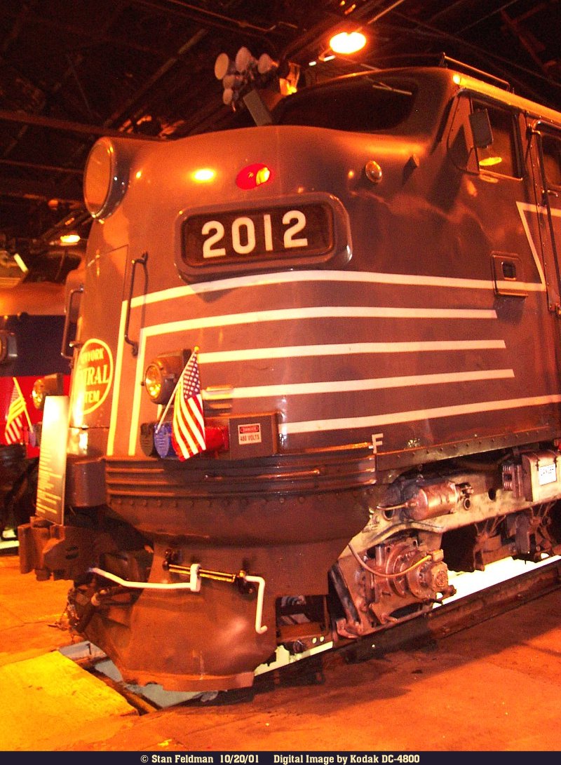 -Click here to see a close front end view of MTA Metro-North Diesel-Electric / Electric Locomotive FL9A # 2012. This locomotive, painted in New York Central Railroad colors, is on display in the Croton-Harmon N.Y.Shop. 10/20/01.