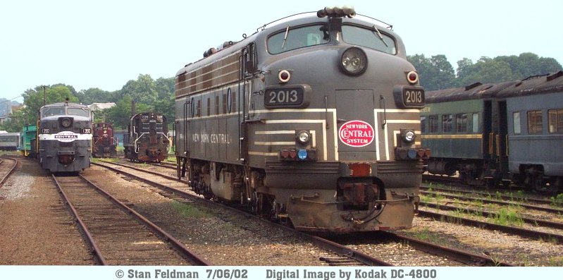 -Click here to see MTA Metro North FL-9 # 2013,( ex Conrail # 5040 ) built by EMD in 1955. This FL9 has a 16 cylinder 1800 HP engine, and was painted in New York Central colors in 1999 to celebrate the 175th anniversary of passenger service on the Hudson Division. It arrived at The Danbury Railway Museum on 5/5/2000. Danbury Connecticut. 7/6/02.