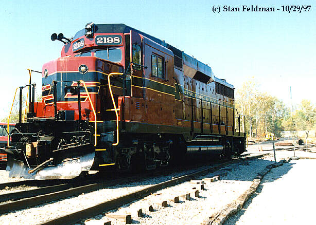 Click here to see New Hope & Ivyland Railroad GP-30 #2198, former Conrail #2198 built by EMD in 1963, sitting near the engine house at New Hope Pa. This engine is owned by private individuals. 10/97.