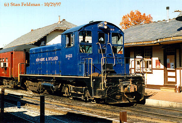 Click here to see New Hope & Ivyland Railroad #9423 pulling into New Hope Station. This engine, an SW-1 built by EMD in 1950, is former Amtrak #739. 11/96.