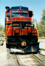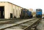 Click here to see New Hope & Ivyland Railroad GP-30 #2198 before it was repainted. This is former Conrail #2198 built by EMD in 1963. It is sitting near the Engine House as NHIL SW-1 #9423 gets ready for a days work. New Hope Pa.,11/4/96.