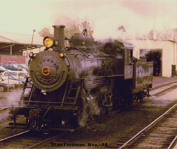 Click here to see New Hope & Ivyland Railroad (Steam) #40, 2-8-0 built by BLW in 1925, getting ready for a run on an overcast day in November 1996.