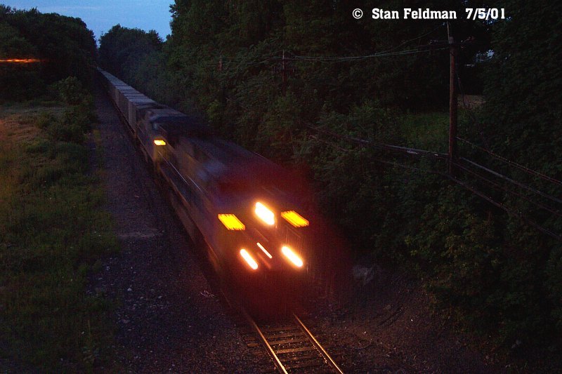 -Click here to see a CSX Trash Train at Cheltenham Junction, Philadelphia Penna. It is running westbound just after dark, at restricted speed. Digital Image by Kodak DC-4800. 7/6/01.| Search Stan's RailPix ! |