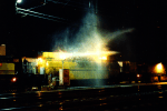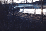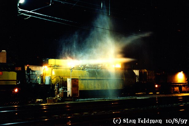 -Click here to see a water tank car in the Loram Rail Grinder Train, sitting on the "0" track at Holmesburg Junction, Phila. Pa. on 10/8/97. The train is testing one of its water hoses, used to cool hot spots after grinding the rails.