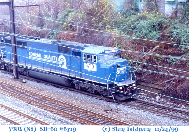 -Click here to see former Conrail, now PRR (Norfolk Southern) SD-60 #6719 with train CAAL. It is running on the Conrail Delair Line, along the Northeast Corridor. The train has just left Frankford Junction, and is heading Westward-Southward. Philadelphia Pennsylvania. 11/24/99.