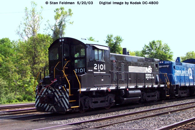 -Click here to see Norfolk Southern SW-1001 # 2101 at work in The Abrams Yard in Montgomery County Pa. This SW1001, former Conrail # 9400, was built by EMD in 1973 and is rated at 1000 HP. It is now painted in Norfolk Southern colors. 5/20/03.