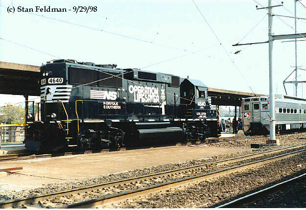 -Click here to see Norfolk Southern (NS) "Operation Lifesaver" GP-59 #4640. This is the first time Norfolk Southern had an engine on display at The Wilmington Transit Festival. Amtrak Station, Wilmington Delaware. 9/26/98.