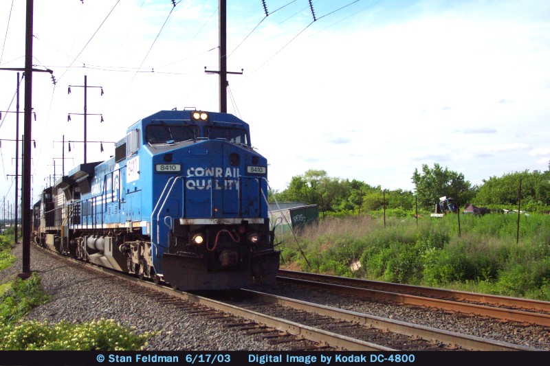 -Click here to Norfolk Southern C-40-8W PRR # 8410, a former Conrail locomotive. This C40-8W, built by GE in 1991 and rated at 4000 HP, is leading Train 48G on The Delair Line. Phila. Pa. 6/17/03.| Search Stan's RailPix ! |