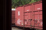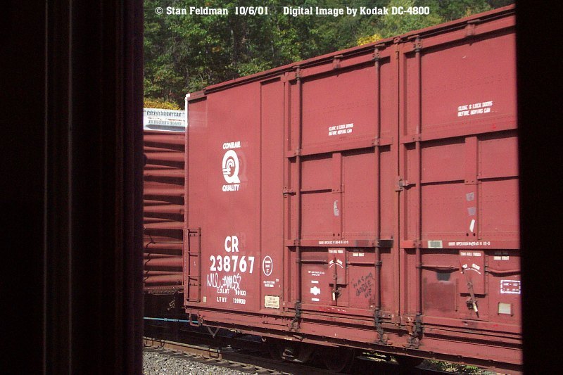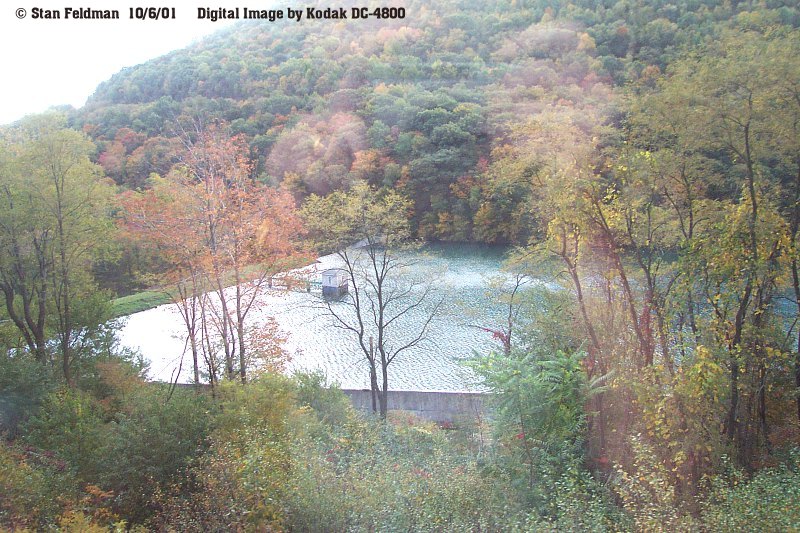 3 additional Digital Images taken from the interior of The Kitchi Gammi Club Car, showing the PRR caboose at the Gallitzin Tunnels, an Altoona Municipal Reservoir, and a Conrail Boxcar on a passing freight train. 3 Altoona Municipal Reservoirs were built by The Pennsylvania Railroad. Altoona Pa. 10/6/01.
