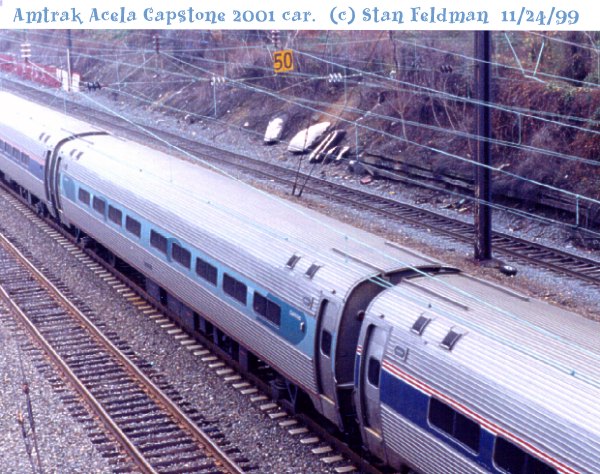 -Click here for a first look at an Acela Capstone 2001 Car. The refurbished Capstone Cars will be used in The Acela Regional Service. Phila. Pa. 11/24/99.