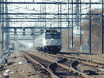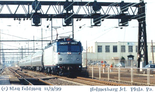 -Click here for a closer look at Amtrak "Acela" (electric) AEM-7-AC #907, an Amtrak/Alstom rebuild rated at 7000hp, running northward-eastward in Metroliner Service. It is passing under the Signal Bridge at Holmesburg Junction (MP 77.2), Philadelphia Pa. 11/9/99.
