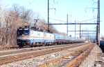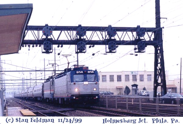 -Click here to see Amtrak Acela AEM-7AC #914, an Amtrak-Alstom rebuild rated at 7000hp, leading a very long Holiday Express Train on an overcast morning, the day before Thanksgiving. Holmesburg Junction, Philadelphia Pennsylvania. 11/24/99.