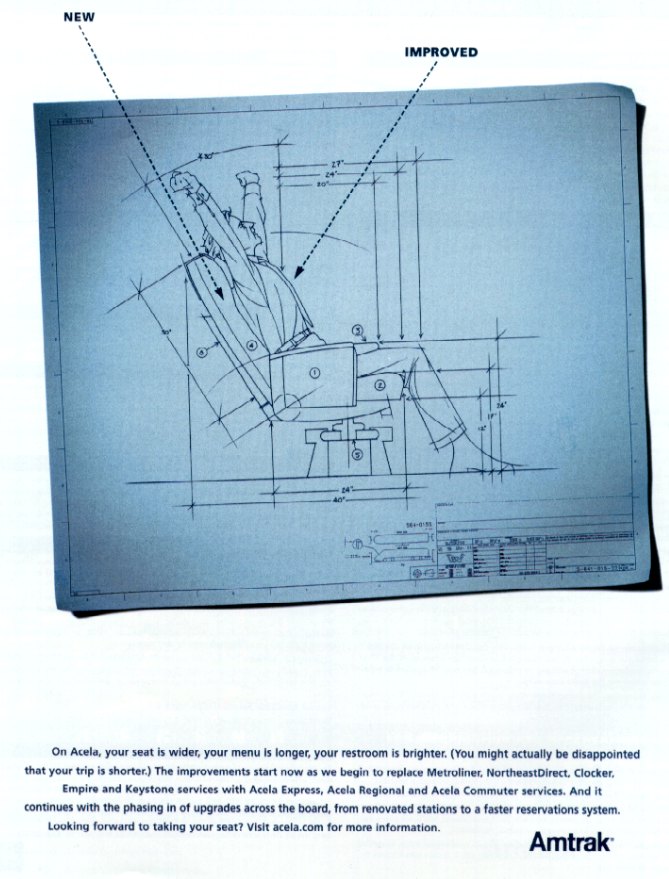 -Click here to see, " A New & Improved" Acela ad. It is from the Amtrak Winter 2000 Timetable, the first timetable with Acela Regional Service. 2/00.