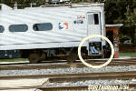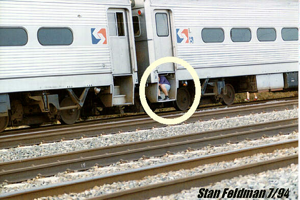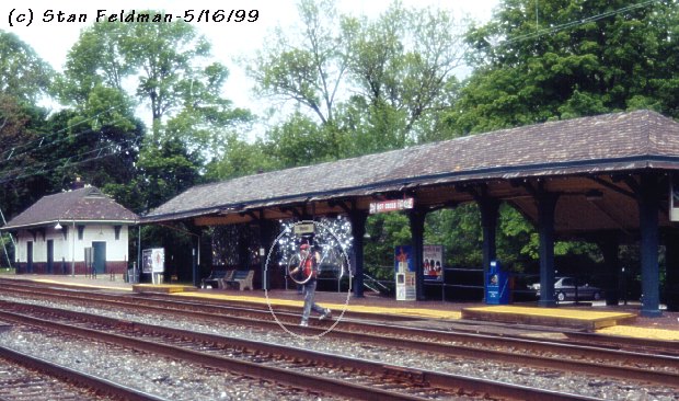 Click here to see a man carrying a bicycle across the 4 track, Amtrak Harrisburg Line at the Merion Station. There is a pedestrian underpass that could be used to SAFELY cross under the tracks. 3 Minutes later Amtrak Train #41 passed through this station. 5/16/99, Merion, Pa.