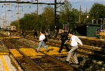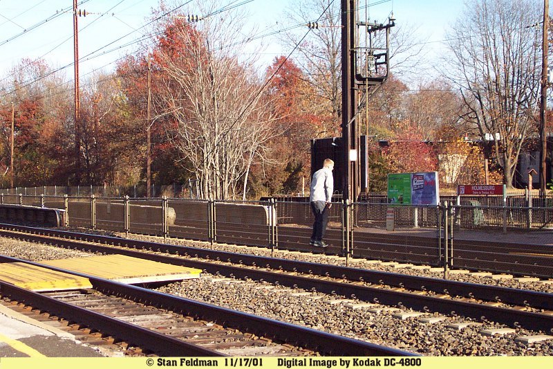 Click here to see a man risking his life climbing the safety fence to cross the Amtrak Northeast Corridor Tracks at Holmesburg Junction, Phila. Penna. These tracks are used by the Acela Express , other Amtrak trains, Septa Trains, and Conrail Freight Trains. 11/17/01.