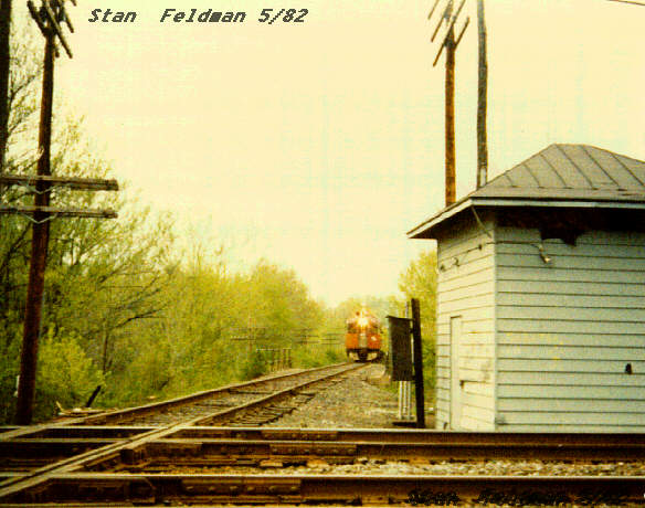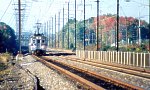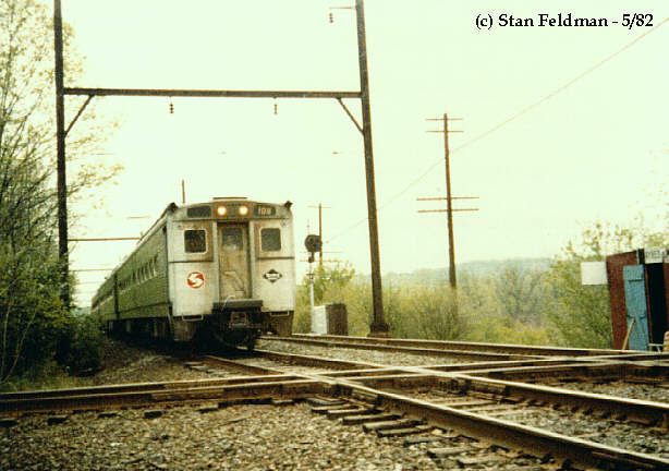 Click here to see a Septa R-3 West Trenton Train approaching The Ayres Junction crossing. This is where the Newtown Line, (no longer in service) crossed the West Trenton Line. The crossing and the Newtown Line are gone. 5/82.