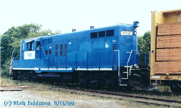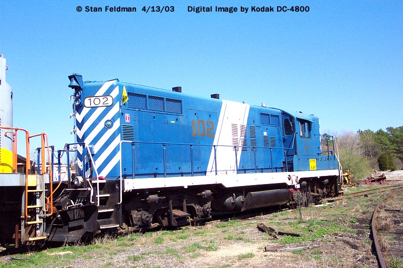 -Click here for a front view of Southern Railroad Company of New Jersey GP-10 #102, at work at Winslow Junction, New Jersey. The front of the engine has been painted white for increased visibility. 8/13/99.