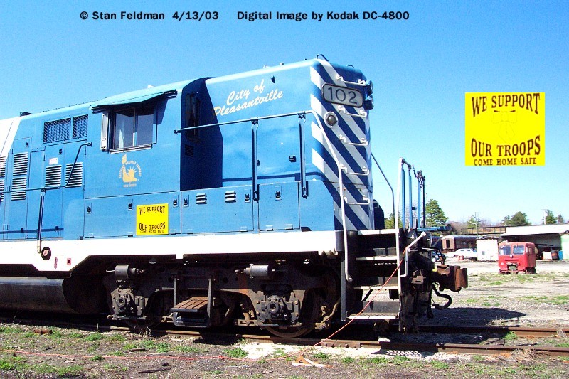 -Click here for a side view of Southern Railroad Company of New Jersey GP-10 #102,"The City Of Pleasantville", ex Conrail # 7550. It is seen here with an updated paint job and a yellow, "We Support Our Troops Sign". Winslow Junction, New Jersey. 4/13/03