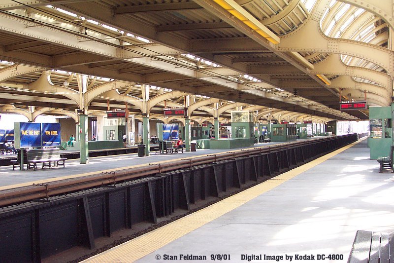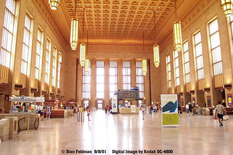 Click here to see the "Great Hall" in The Amtrak 30th Street Station in Philadelphia Penna. The "Great Hall" (main concourse), is 290 feet long, 135 feet wide, with a ceiling height of 95 feet. This station, opened by The Pennsylvania Railroad in December 15, 1933, is the second busiest on the Amtrak System and served 3,675,843 passengers in 1999. Digital Image by Kodak DC-4800. 9/8/01