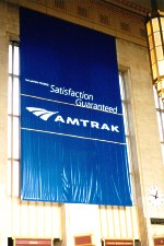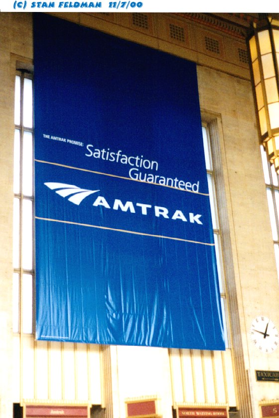 Click here to see the new Amtrak "Satisfaction Guaranteed" Logo. It is on a huge banner in the main concourse of The Amtrak 30th Street Station, Phila. Penna. 11/17/00