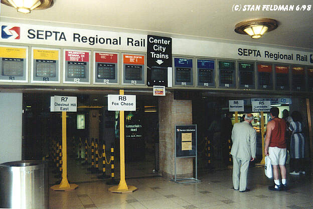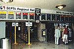 Click here to see the entrance to the Septa Regional Rail Area, in the upper level of the Amtrak 30th Street Station in Phila. Pa. During the 40 day summer 1998 strike of the Septa City Division, which ended 7/11/98, Regional Rail ridership was up over 50 % to about 135,000 passenger trips daily. The signs and chains help to keep people in line for the trains, and keep the train platforms from over-crowding. 6/98.