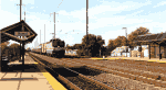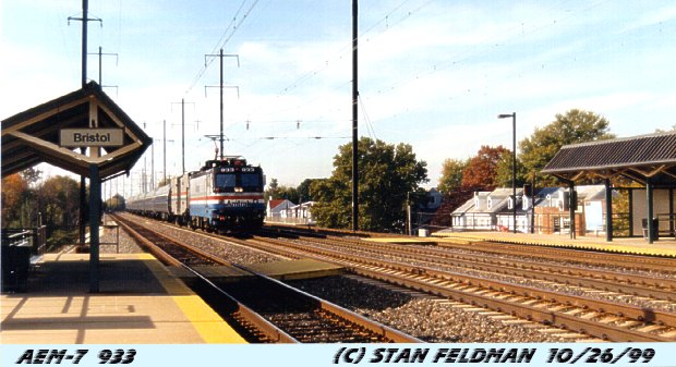 -Click here to see Amtrak AEM-7 #933 running eastbound (north) at the Bristol Pennsylvania Station. The next stop for this Northeast Direct Train is Trenton, NJ. This engine was never repainted with Northeast Direct Colors. Bristol Pa. 10/26/99.